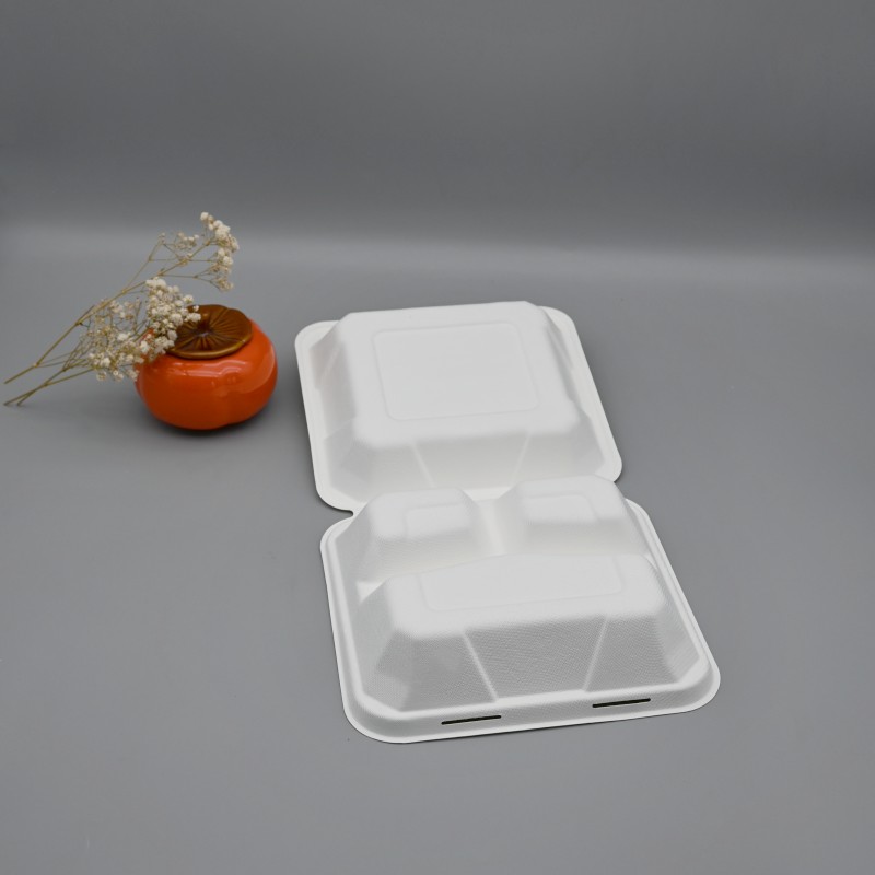 8inch 3com bagasse clamshell Made from renewable energy of sugar cane waste, has 1 compartment for simple takeaway meals and a hinge that allows for easy opening and closing. an eco-friendly resource that is sustainable as well as biodegradable and home compostable.